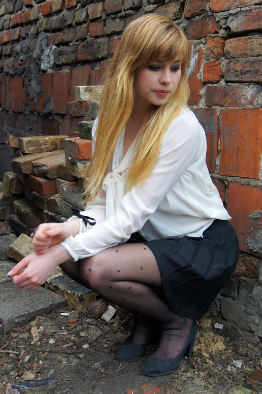 Stylizacja w zupełnie innym klimacie, bez cienia śniegu, w ciepłych kolorach.Czarna spódniczka i pudrowa bluzka. Nie mogłam się zdecydować na dodatki dlatego gdzieniegdzie na zdjęciach mam czarne kolczyki, a gdzieniegdzie naszyjnik ;p Spódniczkę już kiedyś pokazywałam na blogu, jakiegoś wieczoru nie miałam pomysłu na stylizację więc przerobiłam starą sukienkę. Makijaż, fryzura i zdjęcia tym razem są autorstwa Sabiny, mojej utalentowanej wizażystki :)