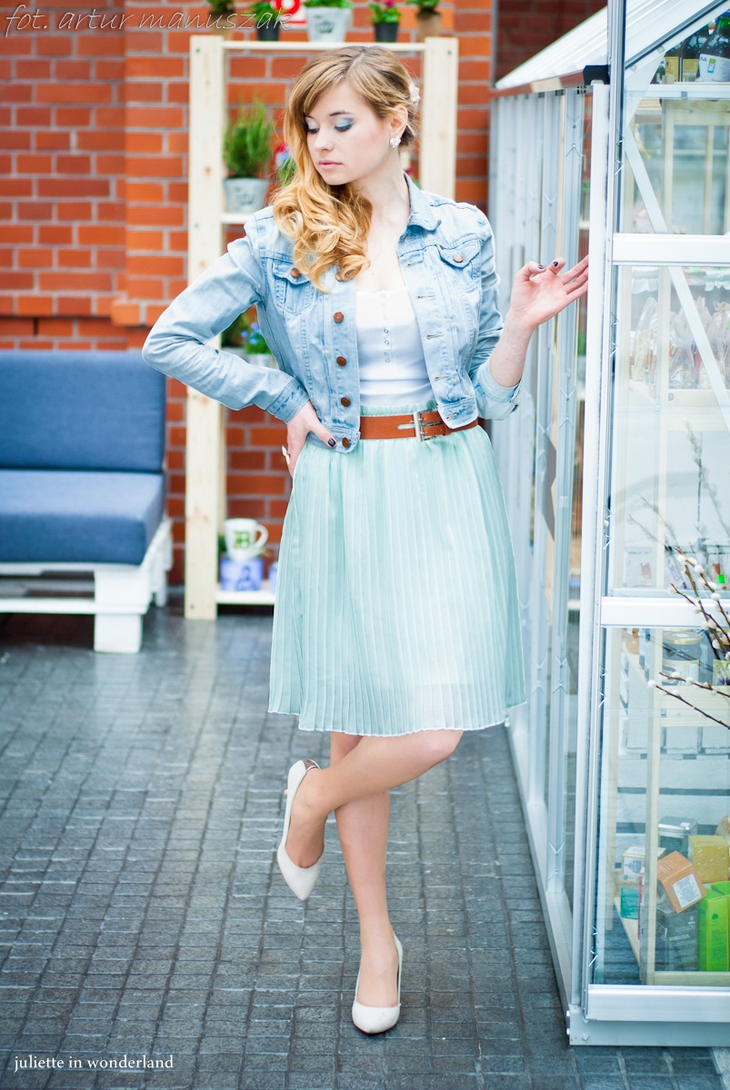 Dzisiejsza stylizacja- połączenie mięty, beżu, bieli i jasnego dzinsu. Główną rolę odgrywa spódniczka- przepiękny kolor, plisy i idealna długość. Do spódniczki dopasowywałam pozostałe częsci garderoby. Rzadko noszę bardzo jasne zestawy, zwykle staram się mieszać delikatne kolory z ciemniejszymi, ale tym razem postanowiłam trochę poeksperymentować. Aby nie było za "mdło" dołączyłam skórzany brązowy pasek.
