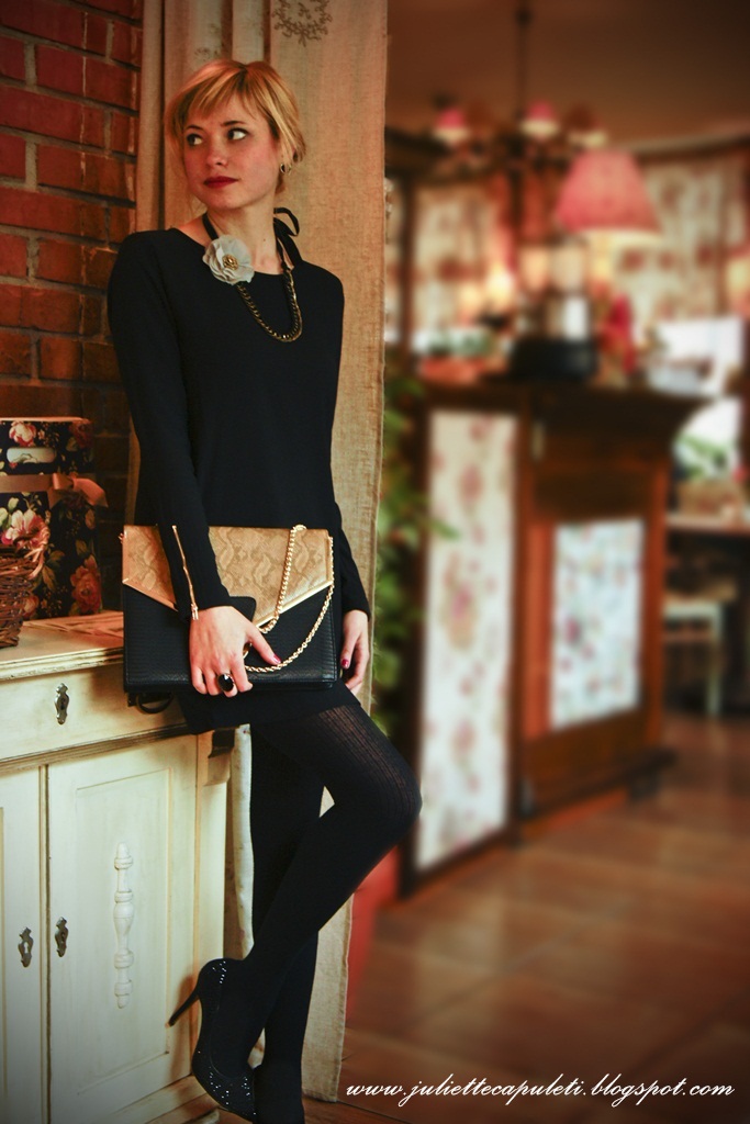 Tym razem prezentuję granatową sukienkę, (kolejną) przeznaczoną tylko na specjalne okazje:) Jeśli jest mowa o elegancji to nie mogło zabraknąć czarnych szpileczek. W tej stylizacji konieczny był mocny akcent więc zdecydowałąm się na jasną kopertówke na łańcuszku, która idealnie pasuje do kołnierzyka z pereł.